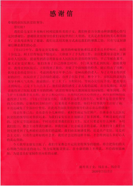 我院始終十分重視扶貧工作,專門抽調(diào)人員組成扶貧工作組,由院領(lǐng)導(dǎo)擔(dān)任組長,扶貧工作組定期深入貧困戶家中進(jìn)行精準(zhǔn)扶貧,切實(shí)為貧困戶疏憂解困,取得了良好效果,得到了受幫扶群眾的高度評(píng)價(jià)。“自新泰市人民醫(yī)院扶貧組的領(lǐng)導(dǎo)結(jié)對(duì)幫扶以來,為我們家實(shí)實(shí)在在地解決了很多困難,不斷送來吃的用的,過年過節(jié)送油送面,平時(shí)還經(jīng)常幫我們打掃衛(wèi)生,反正只要是有什么困難,不要我們張口,都會(huì)主動(dòng)幫我們解決,和我們成了比親戚還親的親戚”。陳傳英子女們?cè)诟兄x信中發(fā)自內(nèi)心地對(duì)我院表達(dá)了深深的感激。
