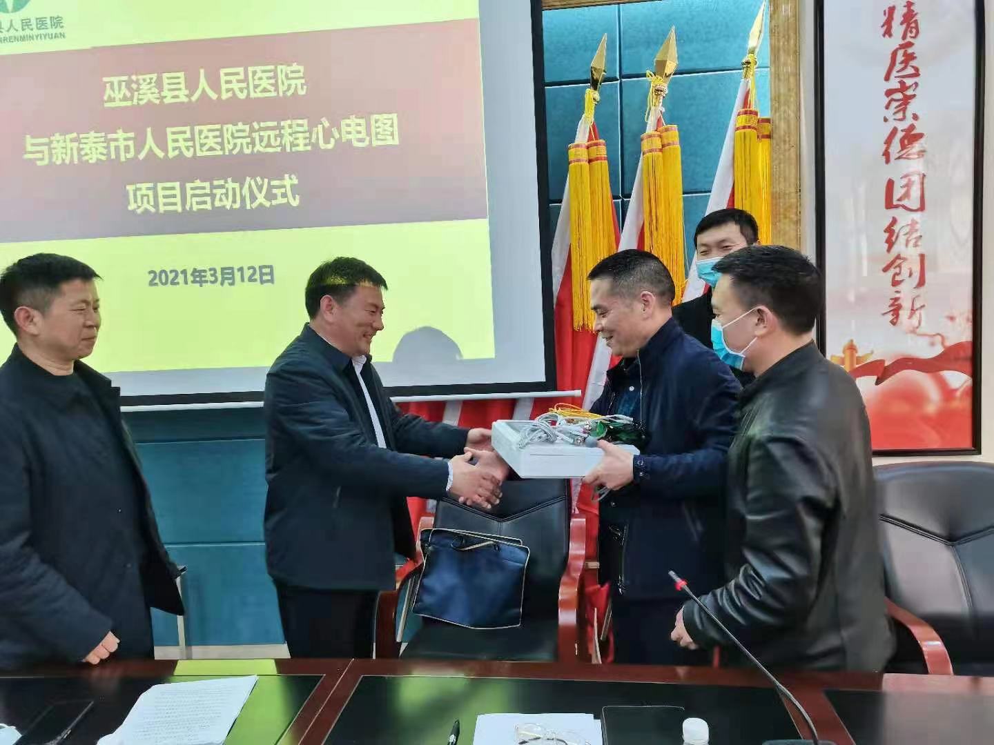 在新泰市人民醫(yī)院院長張傳軍,副院長張鴻雁支持下,新泰市人民醫(yī)院捐贈遠程心電系統(tǒng)于2021年3月12日在巫溪縣人民醫(yī)院正式啟用。泰安市扶貧辦公室主任鄒輝,巫溪縣衛(wèi)建委主任鄔江榮,巫溪縣人民醫(yī)院院長劉學(xué)銀,新泰市人民醫(yī)院趙凱以及山東支援巫溪專家等出席本次遠程心電合作項目啟動儀式。