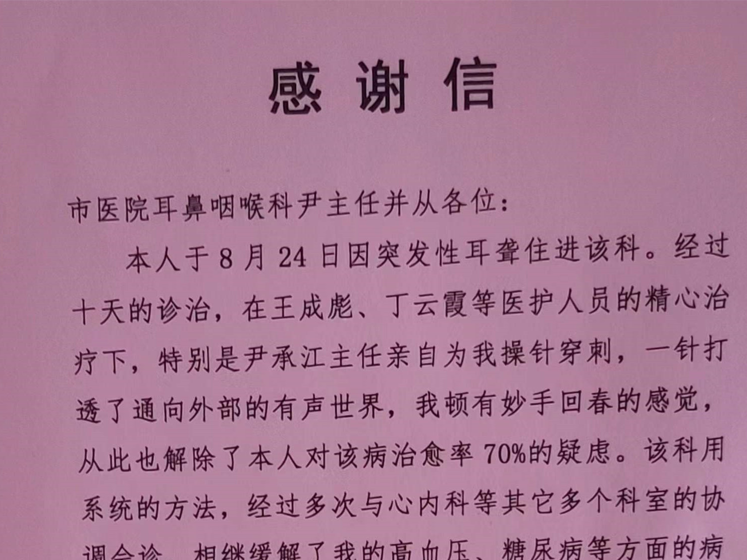 紙短情長(zhǎng) 醫(yī)患情深—老干部為耳鼻咽喉科發(fā)來(lái)感謝信